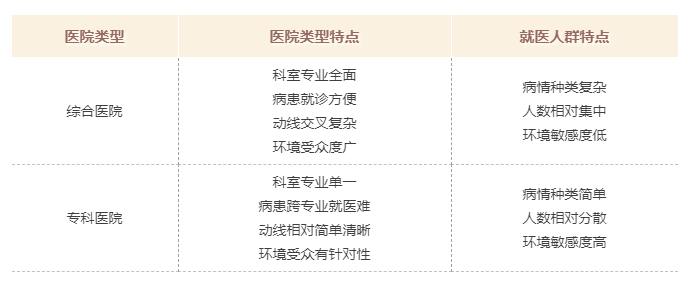 不同的醫(yī)院類型在就醫(yī)人群和醫(yī)院整體設計上有著不同的特征,但是由于運維管理、室內(nèi)設計等多方面的原因,很多患者出現(xiàn)在綜合醫(yī)院看病流程繁瑣、醫(yī)院環(huán)境惡劣的就醫(yī)體驗,而專科醫(yī)院雖然相對就醫(yī)環(huán)境較好,但高價格也給老百姓造成了心理壓力。