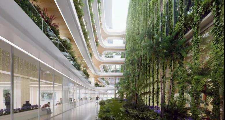 花園式醫(yī)院追求綠意盎然自然治愈,讓空間充滿生機和活力。主要通過內(nèi)裝設計來打造,可以采用局部綠植墻點綴空間,合理利用采光中庭及庭院,實現(xiàn)室內(nèi)室外借景,也可以局部植入綠植景觀小品,增強細節(jié)感。