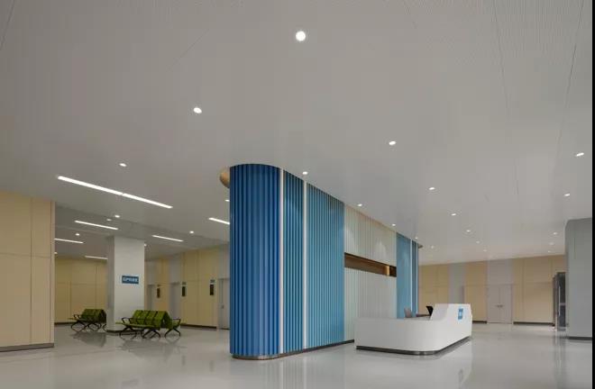 醫(yī)技樓門診空間人流量較大,功能上屬于集約等候、辦理、中轉、接待的樞紐性空間,集約滿足未來就醫(yī)功能的信息化體現(xiàn),進行人工掛號+線上自組掛號系統(tǒng)、互動屏幕等點位設置,在營造婦女兒童醫(yī)院氛圍同時,采用簡潔照明系統(tǒng)和耐久易清潔環(huán)保材料,在醒目多變色彩空間中相對更加突出簡潔、白凈,便于識別。