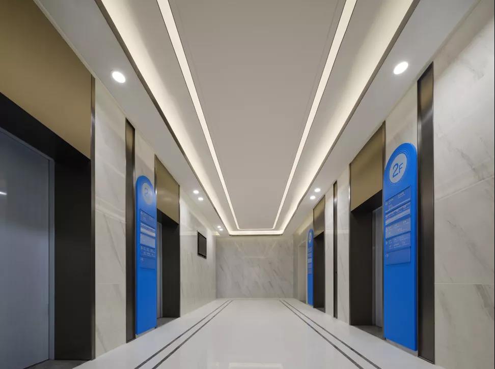 ▲ 圖45 人性化/專業(yè)化/尊貴化:醫(yī)技樓電梯廳采用易于引導標識系統(tǒng)、防炫光暗藏燈光、采用石材和不銹鋼材質品質,體現(xiàn)空間品質感特性