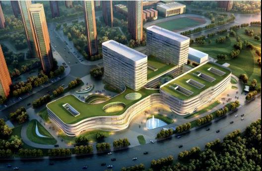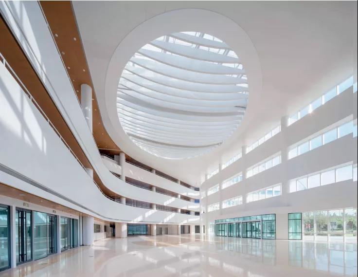 由于院區(qū)用地呈不規(guī)則的梭形,且用地處于西側城市主要交通與東側居住區(qū)的過渡區(qū)域,方案創(chuàng)新性地引入“城市客廳”的設計理念,用地中心位置的開敞共享公共大廳不僅作為與城市、居住區(qū)進行空間對話的形象節(jié)點,而且將整個院區(qū)各功能自然地整合在一起。