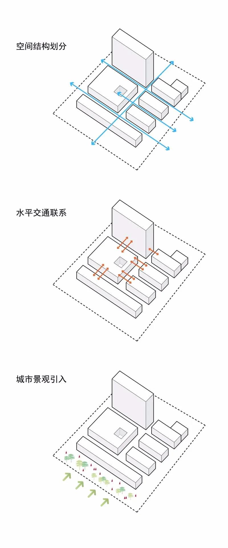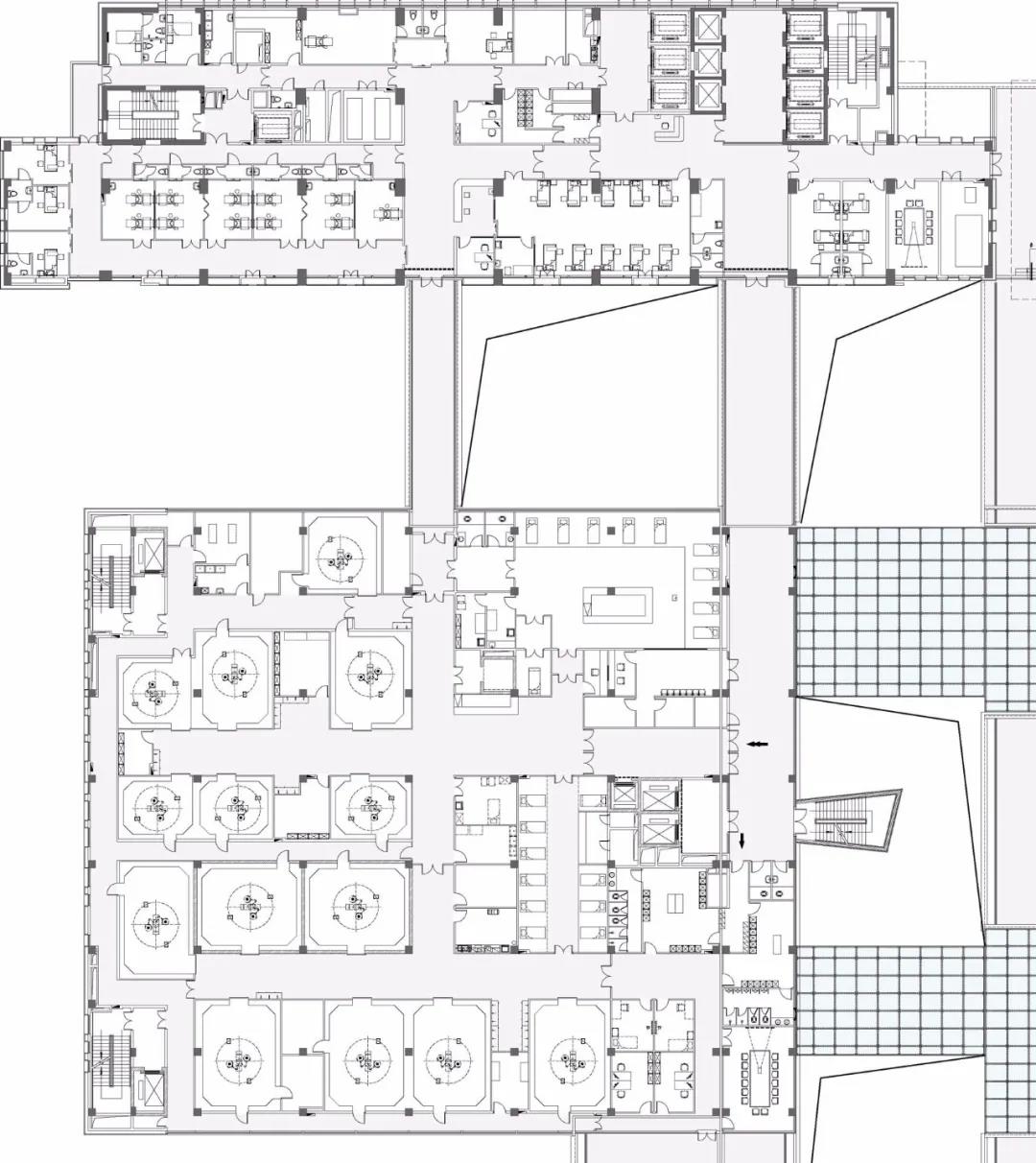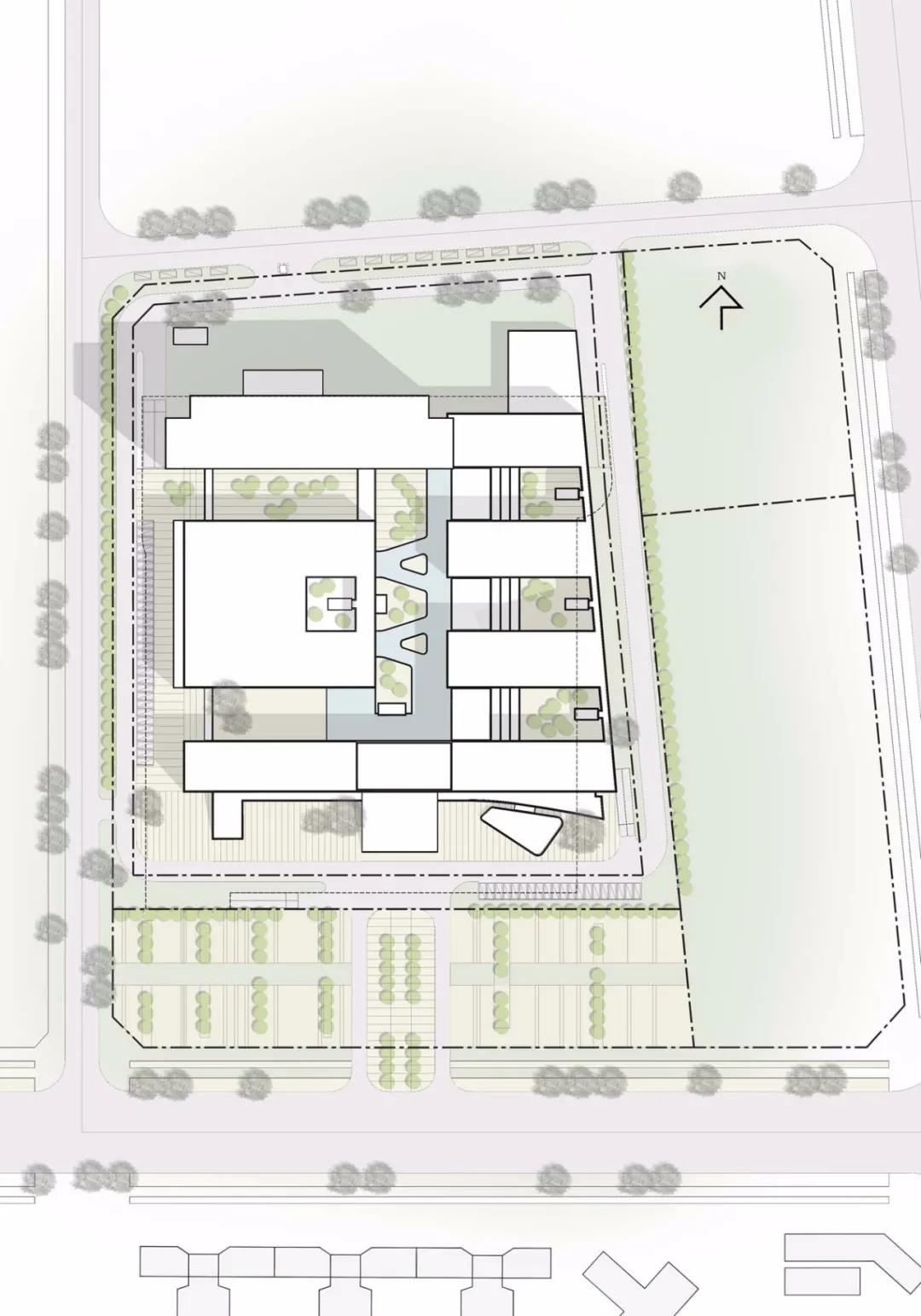 CAPOL負責進行從方案到施工圖全過程的建筑設計總承包工作,創造性地采用“緊湊型三角形結構”:以醫療技術部門為核心,門診部將布置在人流較多的城市主干道,住院部是遠離城市主干道和噪音源的。三角形布局形成的最短會診、急救流線和分層掛號系統,創造出了高效的就醫體驗。