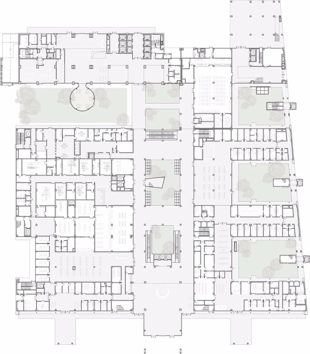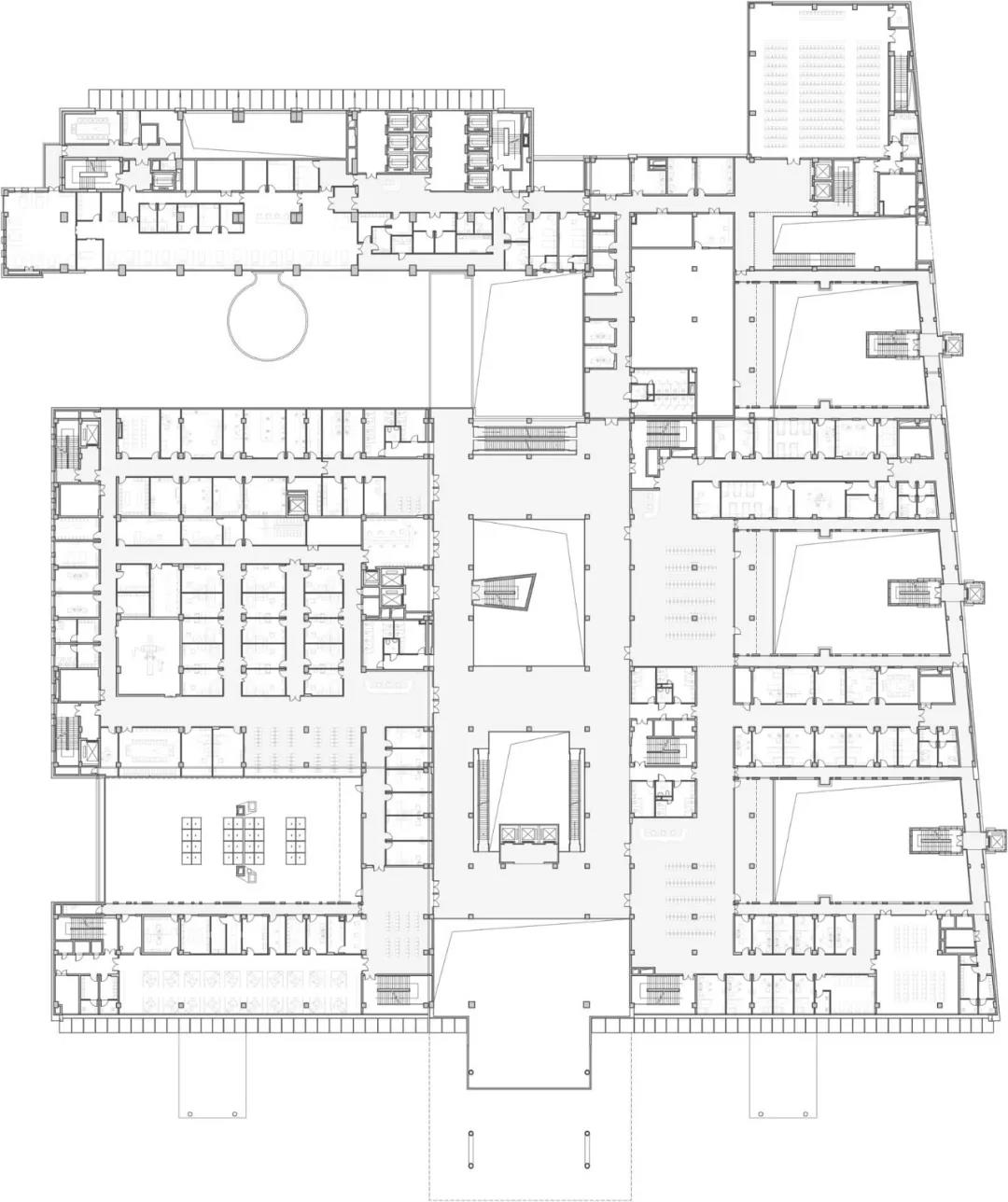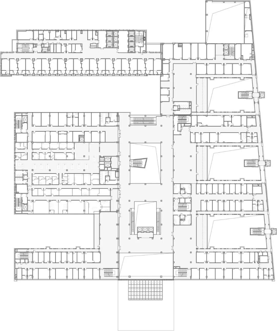 CAPOL負責進行從方案到施工圖全過程的建筑設計總承包工作,創造性地采用“緊湊型三角形結構”:以醫療技術部門為核心,門診部將布置在人流較多的城市主干道,住院部是遠離城市主干道和噪音源的。三角形布局形成的最短會診、急救流線和分層掛號系統,創造出了高效的就醫體驗。