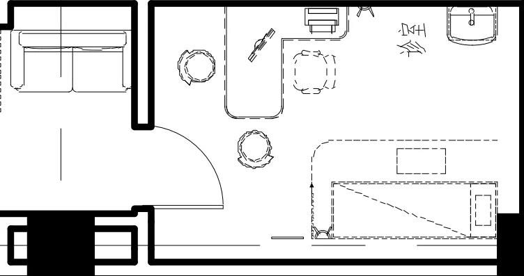 建議進(jìn)行標(biāo)準(zhǔn)化布置,以滿足基本診療的需求。向內(nèi)平開門并靠深側(cè)墻,門方向深側(cè)墻對(duì)側(cè)設(shè)置診桌,診桌后方同側(cè)墻距離1米以外處布置洗手盆,防止水外濺腐蝕診桌。建議使用感應(yīng)式水龍頭設(shè)置,洗手盆下水管做U型彎方便檢修,洗手盆下做美觀的裝飾柜。水池上方30-50厘米以上貼墻梳妝鏡,保證門診醫(yī)生以良好的形象服務(wù)患者。檢查診床設(shè)置在洗手盆對(duì)側(cè)深側(cè)貼墻擺放,婦產(chǎn)科、耳鼻喉科、眼科等檢查床(椅)設(shè)備可布置在同側(cè),朝向可根據(jù)醫(yī)生診療習(xí)慣布置。檢查床必須設(shè)置隔簾,保護(hù)隱私。空調(diào)出風(fēng)口宜設(shè)置在診室門上,且側(cè)送風(fēng)為最佳,可避免直吹醫(yī)生或患者,且保證室內(nèi)空氣循環(huán)。