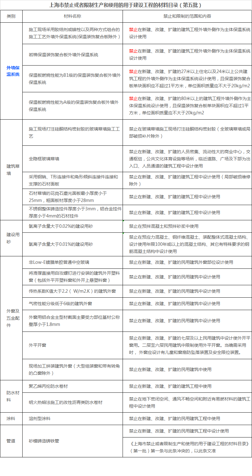 上海市住房和城鄉建設管理委員會公布了《上海市禁止或者限制生產和使用的用于建設工程的材料目錄(第五批)》。